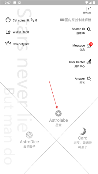 1、打开占星猫应用,在主界面中点击星盘选项,进入星盘相关操作页面。