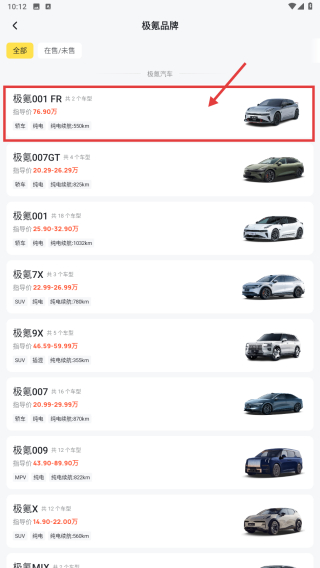 2、在选车页面,选择极氪品牌,进入极氪品牌车型列表页面。
