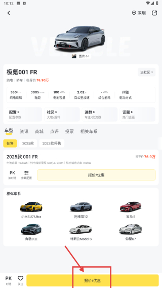 3、选择极氪001 FR车型条目,进入车型详情页面。