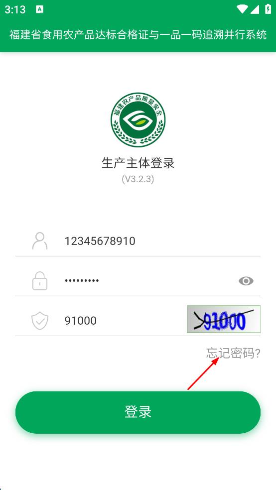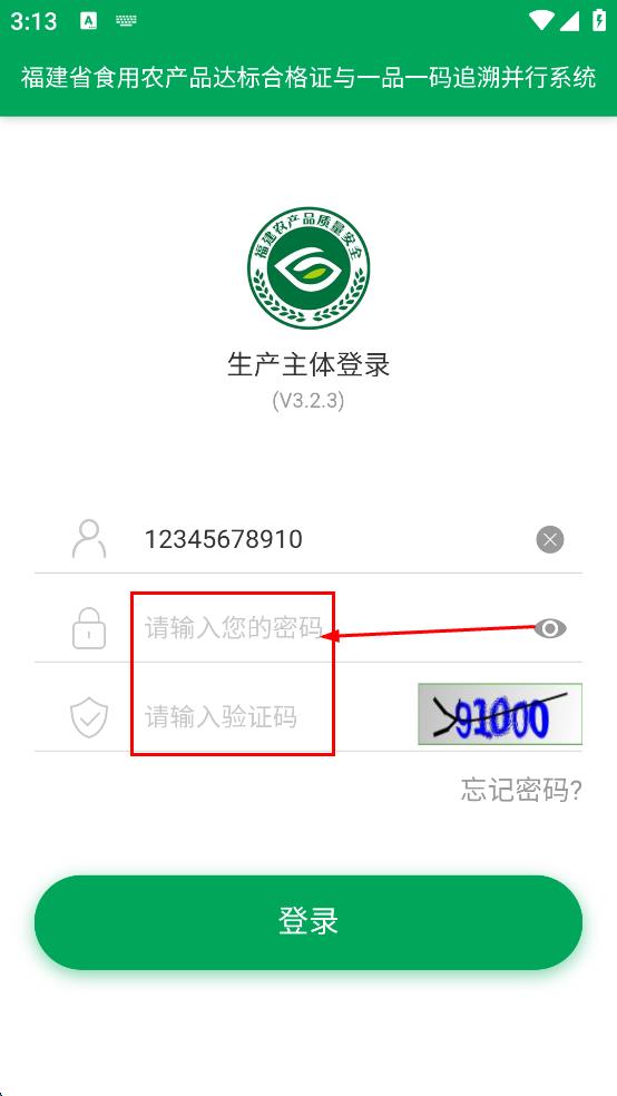 1、打开福建省食用农产品达标合格证与一品一码追溯并行系统,进入生产主体登录页面,在密码输入框输入密码。