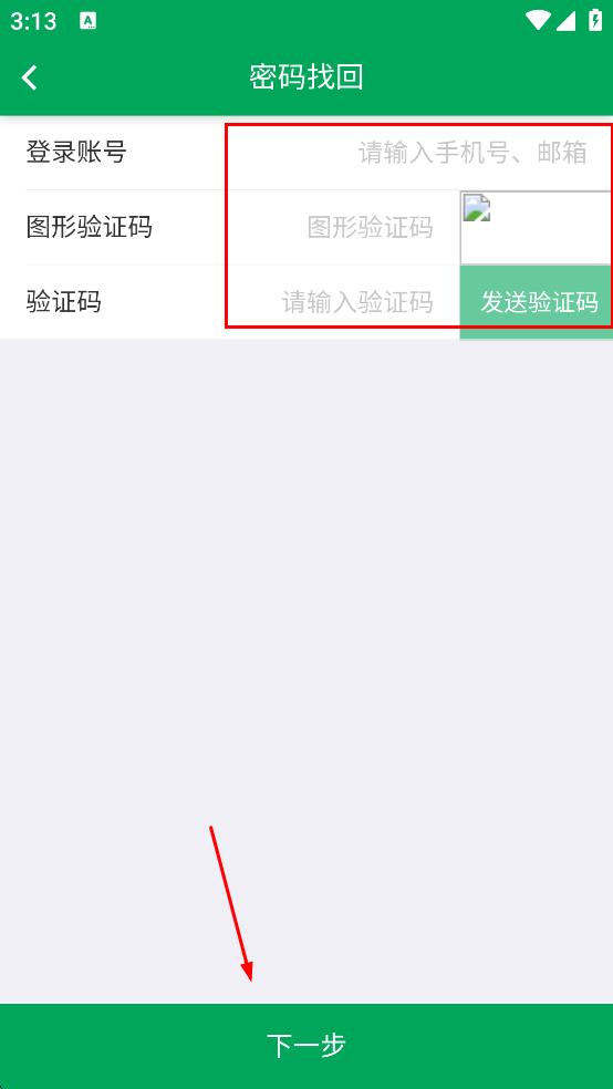 4、在密码找回页面输入登录账号、图形验证码,点击发送验证码并输入,然后点击下一步。