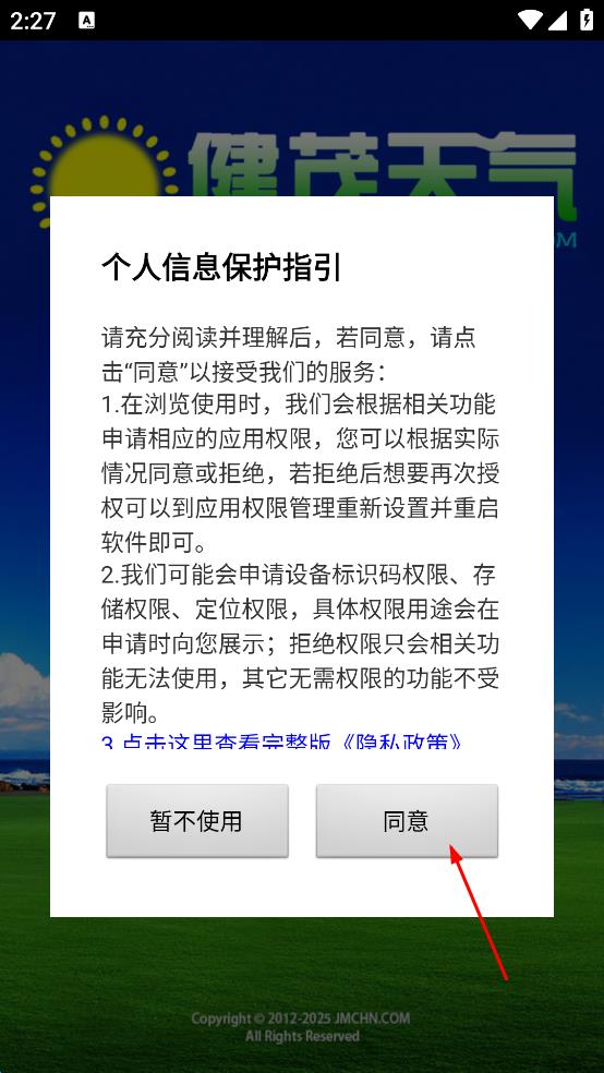 1、打开健茂天气应用,在个人信息保护指引弹窗中,点击同意按钮,进入城市选择界面。