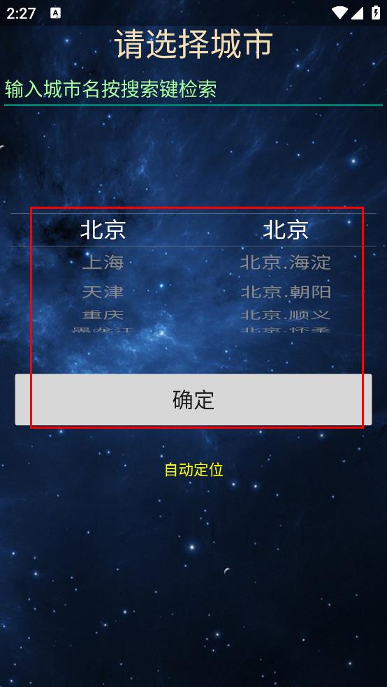 2、在城市选择界面,选择要查看天气的城市,点击确定按钮,进入城市管理页面。