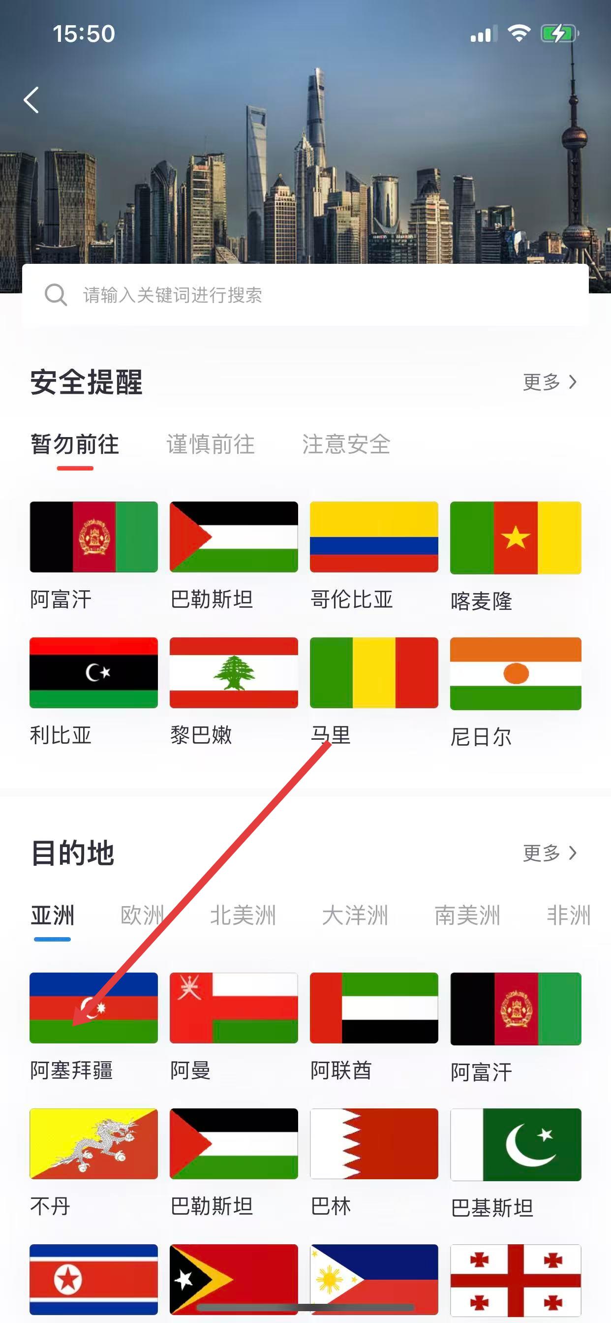 2、在目的地页面,选择想要查看的国家,比如阿塞拜疆。