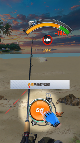 2、当出现长按来进行收线!提示后,点击并长按收线按钮,开始收钓鱼线。