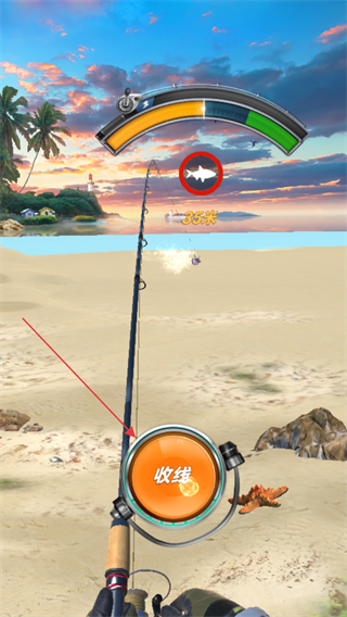 3、收线过程中,留意上方的进度条和鱼的图标,调整收线节奏,避免鱼逃脱。