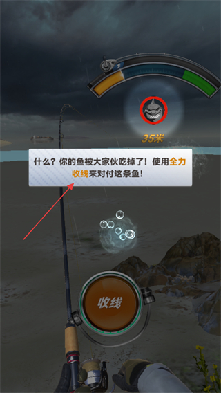 4、遇到提示什么?你的鱼被大家伙吃掉了!使用全力收线来对付这条鱼!时,加大力度长按收线按钮,直至成功钓到鱼。