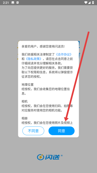 1、在打开闪送员app后,通过点击弹窗中的同意按钮,进入使用。