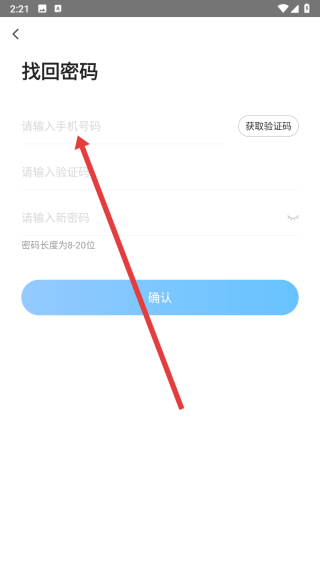 4、跳转到找回密码页面后,点击输入框填写手机号获取验证码后,完成找回操作。