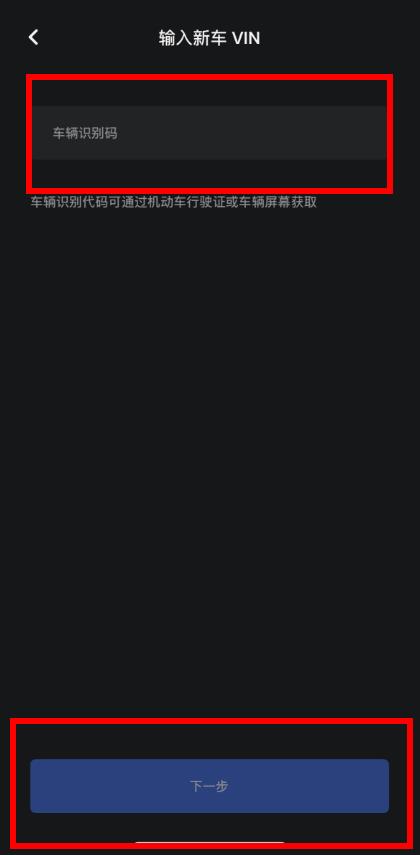 4、在输入新车VIN界面,准确输入车辆识别码,输入完成后点击下一步,按照后续提示完成车辆绑定操作。