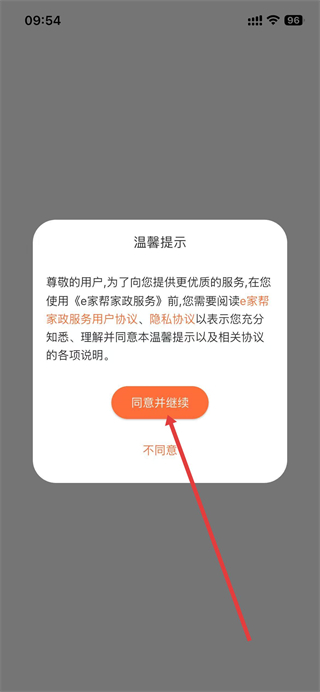 1、打开e家帮家政,在弹出的页面,点击同意并继续。