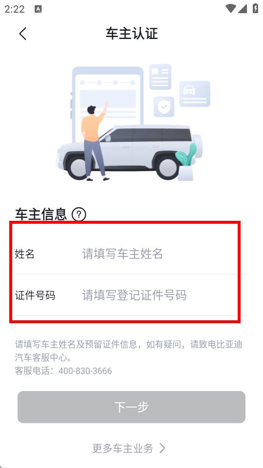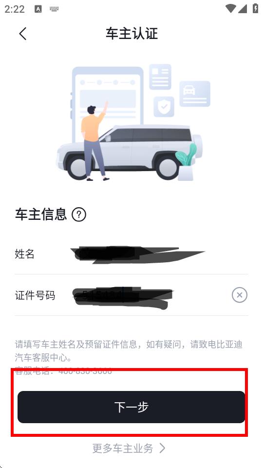 4、确认信息填写无误后,点击下一步,按照后续提示完成车主认证操作。