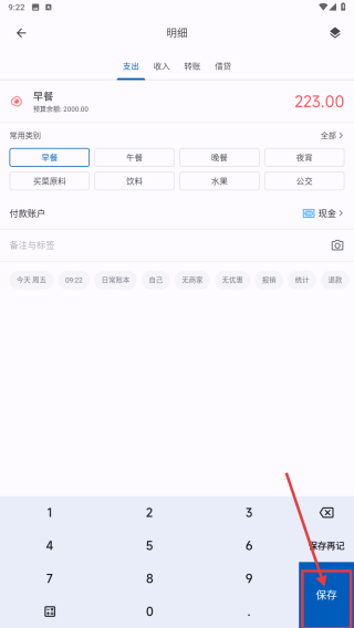 2、在明细录入页面,选择早餐分类,输入消费金额223。