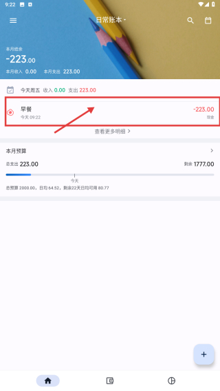 4、返回首页,可查看今日早餐支出-223.00的记账记录。