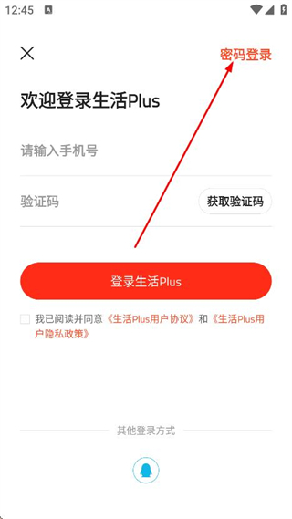 2、在登录页面,找到并点击右上角密码登录按钮。