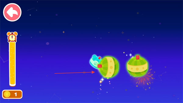 2、成功击中球体后,球体会绽放出绚丽的光影效果,同时会掉落金币,记得收集左侧的金币,金币数量显示在左下方如1。
