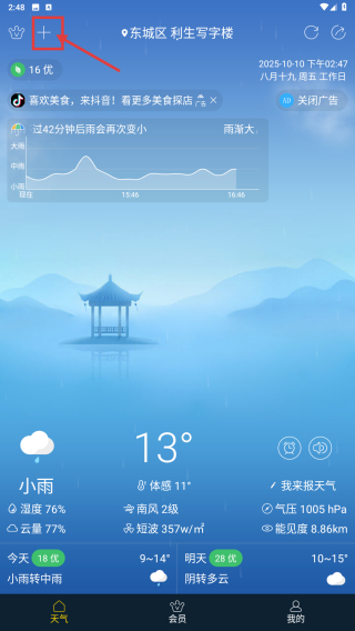 1、打开天气类应用,点击左上角+号图标,进入城市管理页面。