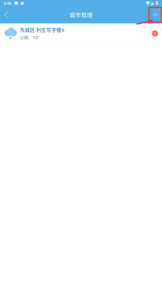 2、在城市管理页面,点击右上角+号图标,进入添加城市页面。