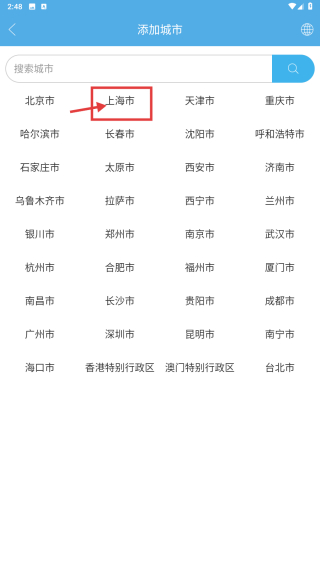3、在添加城市页面,选择上海市,完成城市添加操作。