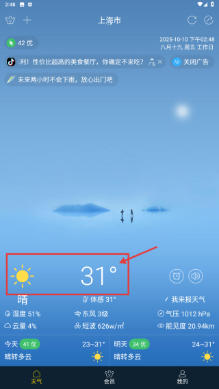 4、查看上海市天气信息,显示为晴,气温31°,湿度51%,东风3级。