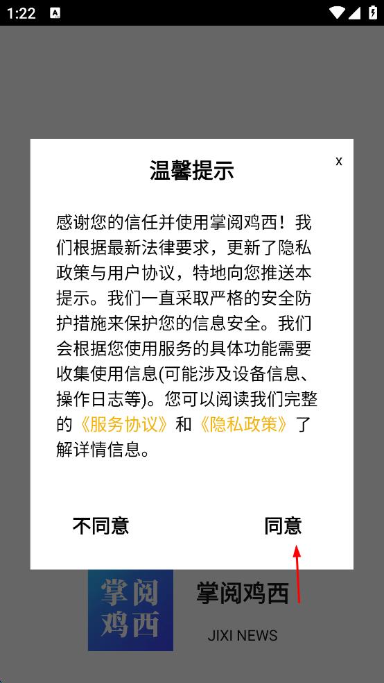 1、打开掌阅鸡西,会弹出温馨提示页面,仔细阅读后点击同意按钮。