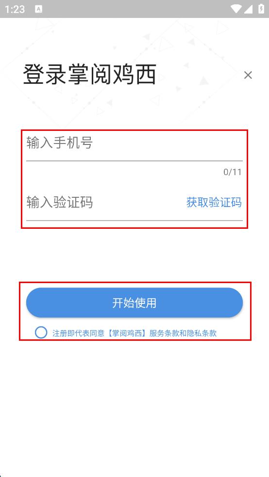 4、在登录界面,输入手机号,获取并填写验证码,勾选相关条款后点击开始使用按钮。