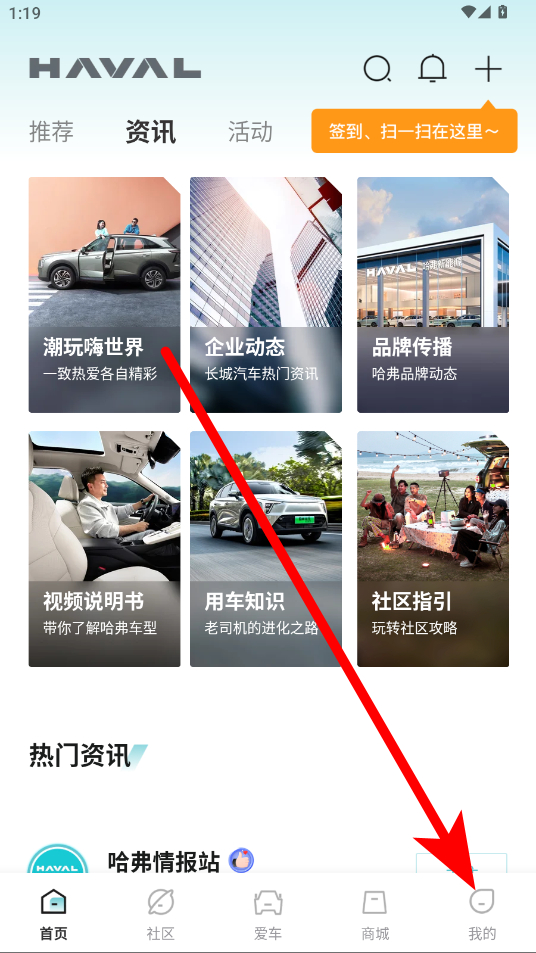 1、打开哈弗智家APP,在首页点击底部导航栏中我的选项,进入个人界面。