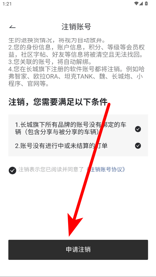 4、在注销账号页面,勾选同意相关协议,点击申请注销按钮,即可完成账号注销操作。