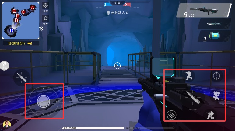 4、使用左侧摇杆控制角色移动走位,右侧按钮可进行射击、蹲伏和跳跃动作。