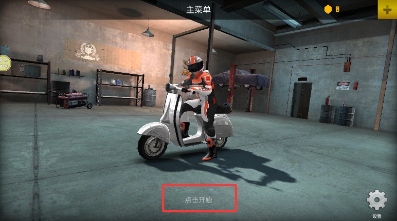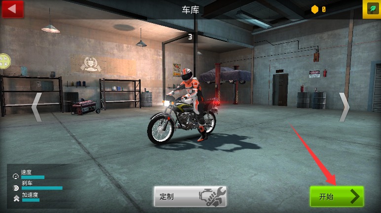 2、在车库界面浏览多种摩托车造型,选择心仪车辆后点击开始进入竞赛。