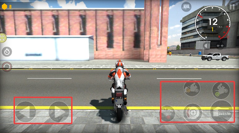 3、使用左侧按钮控制摩托车左右转向,右侧按键分别控制加速行驶与刹车倒车。