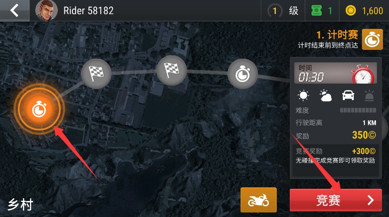 3、从多个赛道中选择想要挑战的关卡,点击开始竞赛按钮进入竞速准备界面。