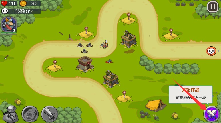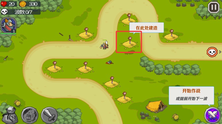 2、点击开战按钮进入防御塔布置界面,根据敌人行进路线规划塔防布局。