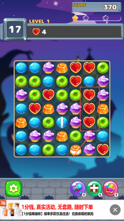3、遇到难关时使用甜蜜道具,不同道具效果不一样,比如有的能消除一整行糖块,有的能随机消除指定颜色糖块,合理使用能快速过关。