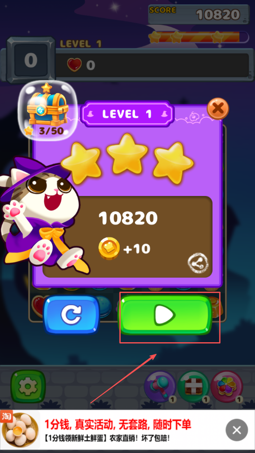 4、当消除的方块数量或达成其他目标要求后,就能顺利过关,此时点击界面上的下一关按钮就能继续挑战。