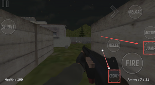 1、进入游戏后通过点击CROUCH下蹲规避敌人视线,利用JUMP跳跃越过障碍物灵活移动。