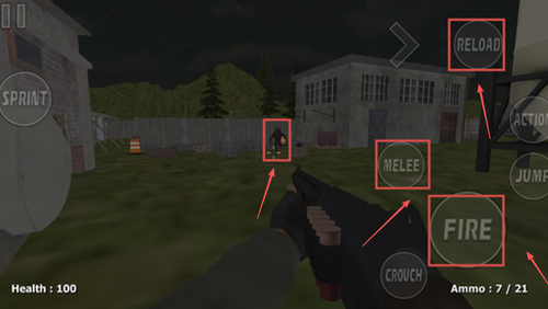 2、发现敌人时调整准心瞄准,点击FIRE进行射击,弹药不足时及时点击RELOAD装填子弹。