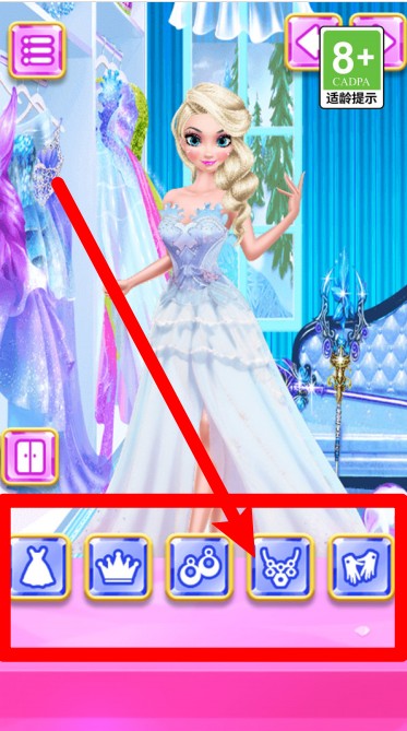 3.换装操作:底部的换装按钮包含礼服、头饰、饰品等多种类别,玩家可自由挑选搭配,打造独特而梦幻的婚礼造型。