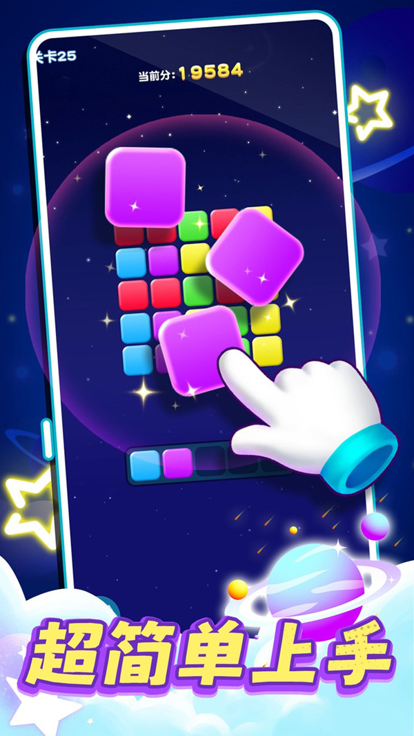 1.连爆星星:玩家只需点击相同颜色方块即可触发连爆,数量越多分数越高,爽快的爆破音效让体验充满解压与趣味性。