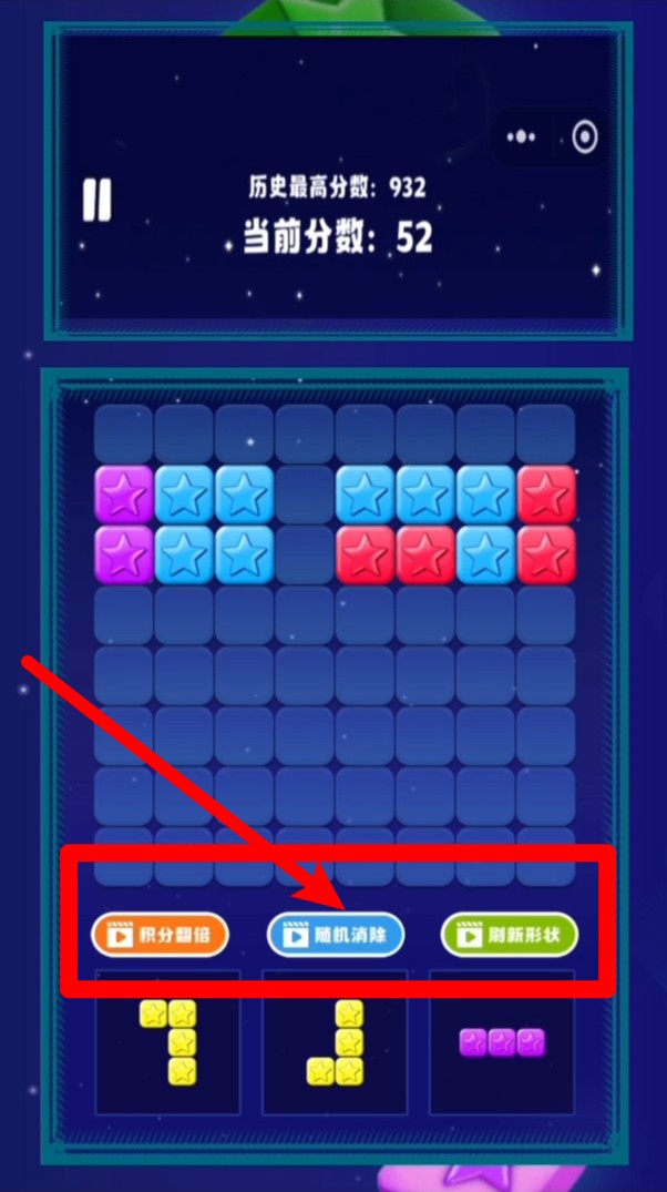 3.特殊道具:底部提供积分翻倍、随机消除和刷新形状等功能,合理使用可帮助玩家化解困境,提高分数与过关效率。