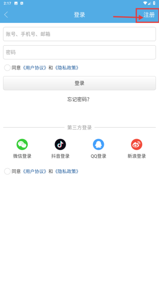 3、在登录/注册界面,点击注册选项,进入注册页面。