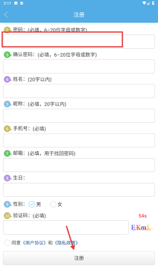 4、在注册页面,依次填写密码6-20位字母或数字点击注册按钮,完成账号注册操作。