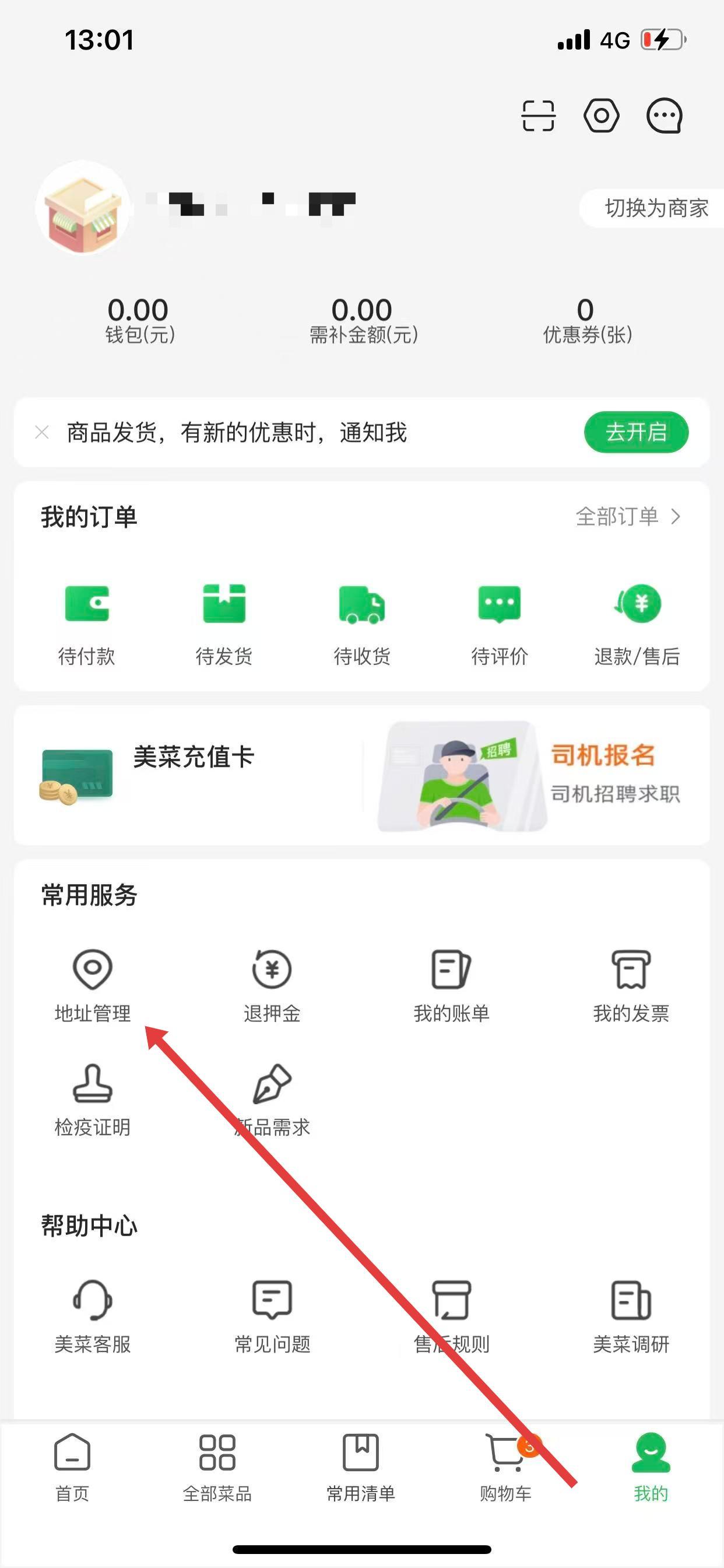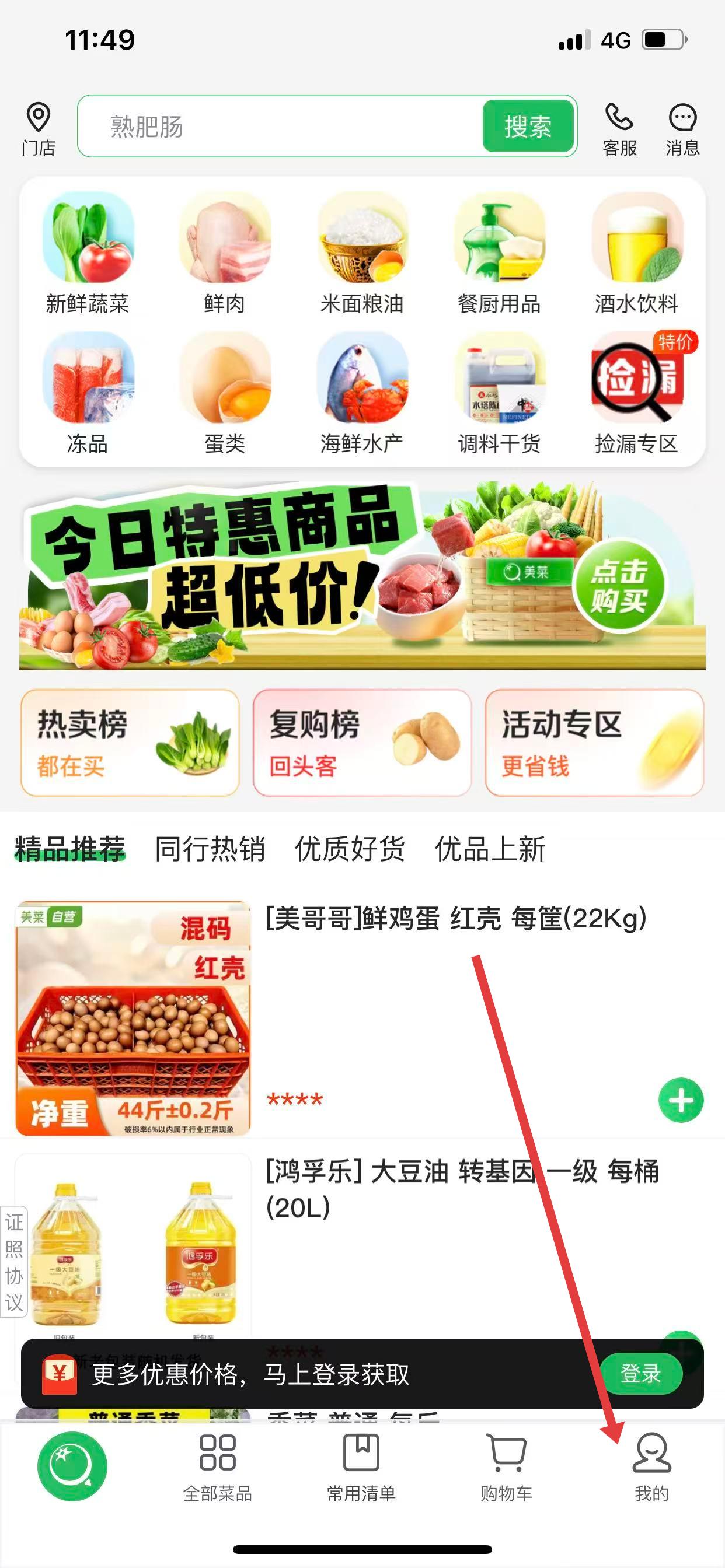 1、打开美菜商城应用,点击底部导航栏中的我的。