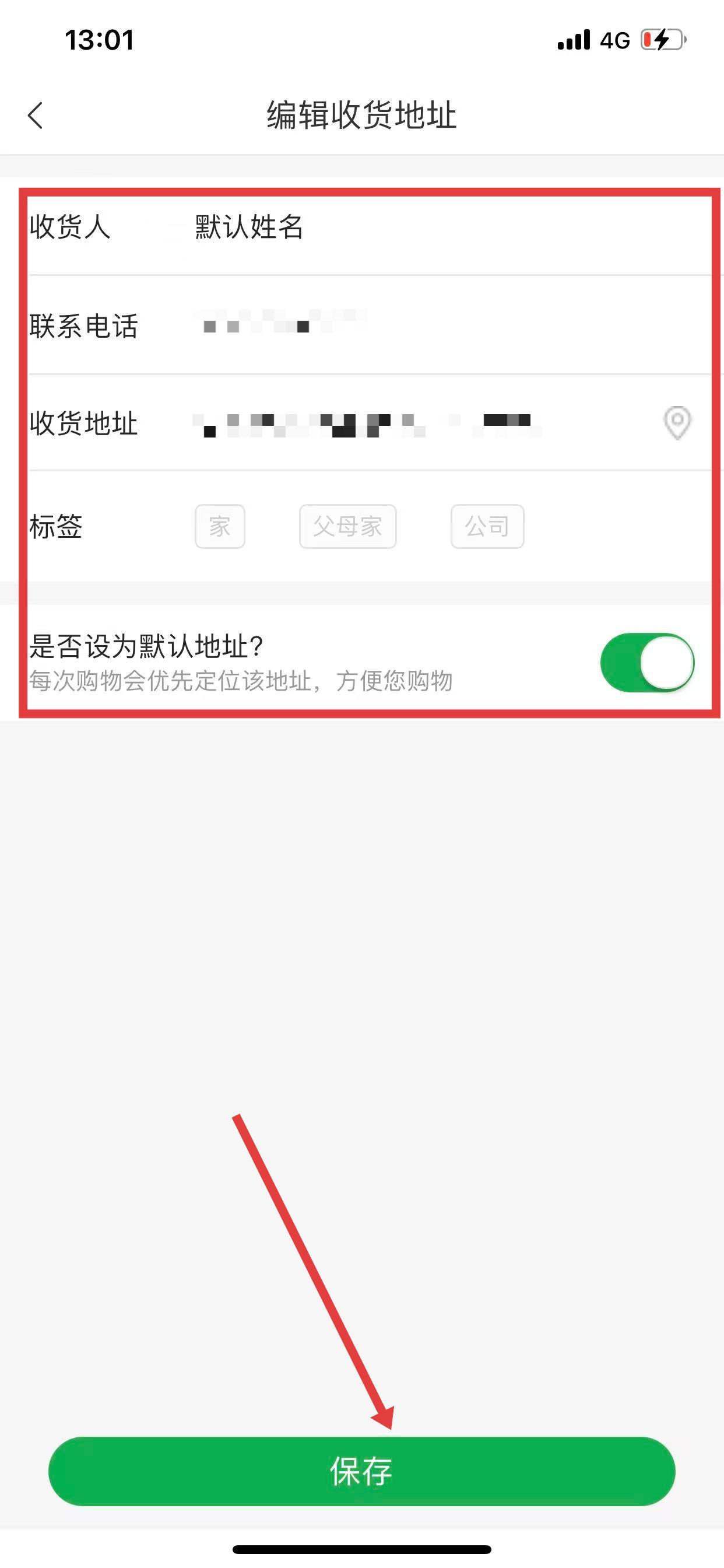 4、在编辑收货地址页面,修改信息,完成后点击保存按钮,即可完成地址修改。