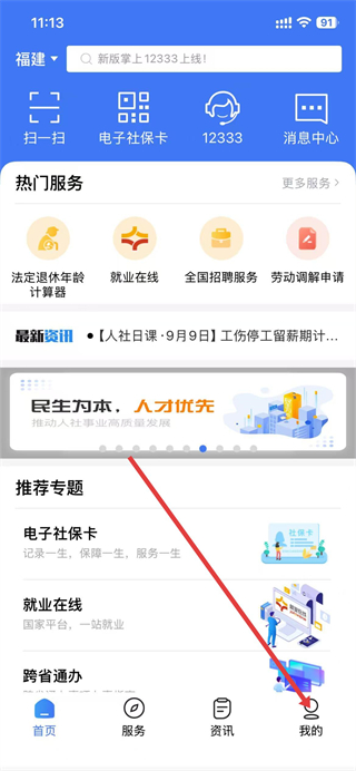 1、打开掌上12333,点击底部导航栏最右侧我的。