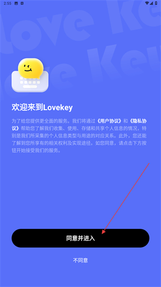 1、打开Lovekey键盘APP,进入时会弹出用户协议与隐私协议,熟知后点击同意并进入的按钮。