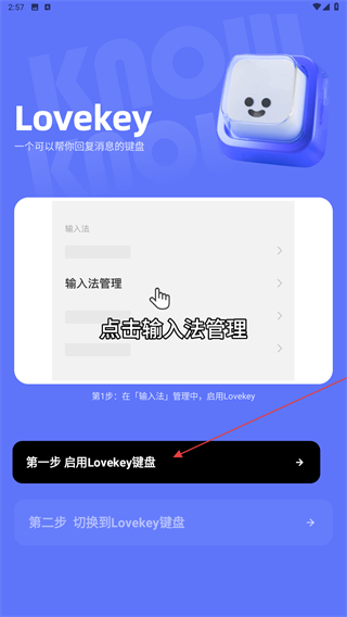 2、进入到首页内,点击启用Lovekey键盘的按钮。
