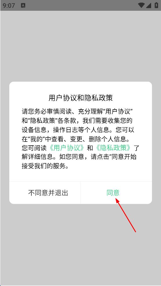 1、进入软件后,会弹出用户协议和隐私政策提示框,仔细阅读相关内容后,点击同意按钮。