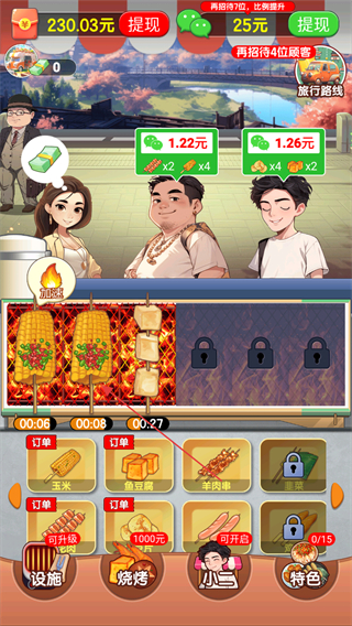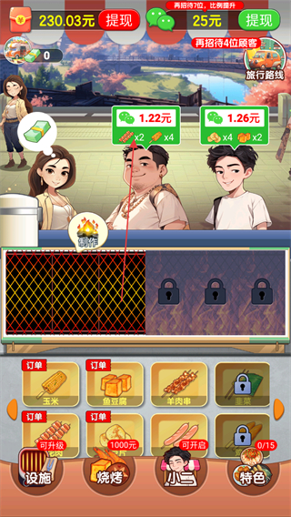 1、进入游戏,查看屏幕上方现金数额230.03元,了解提现条件,留意顾客消费金额提示,如1.22元。