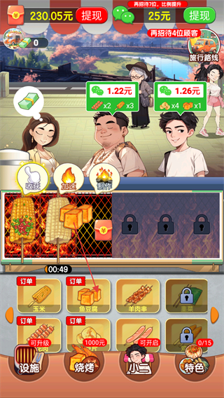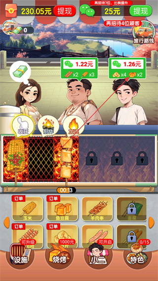 3、烤制完成后,点击烧烤上方的烧烤架按钮,将烤好的食物提供给顾客获取收入。